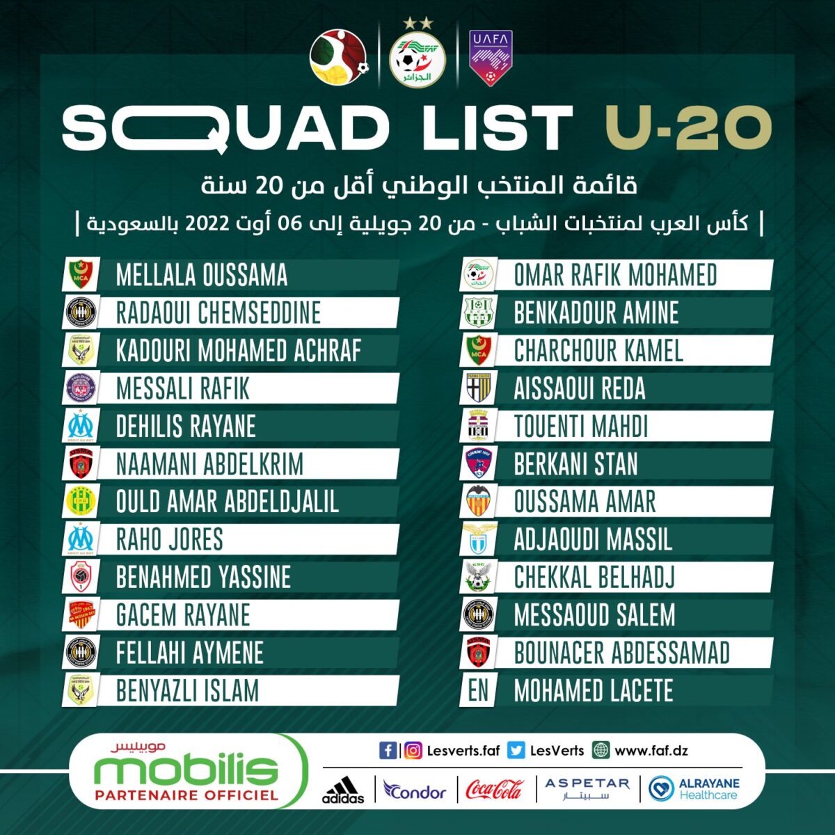 On note aussi la présence de Mohamed Omar Rafik (AC FAF), qui vient de disputer les Jeux Méditerranéens d'Oran avec la sélection U18, ou encore des binationaux Oussama Amar (Valence CF) et Reda Aissaoui (Parme).