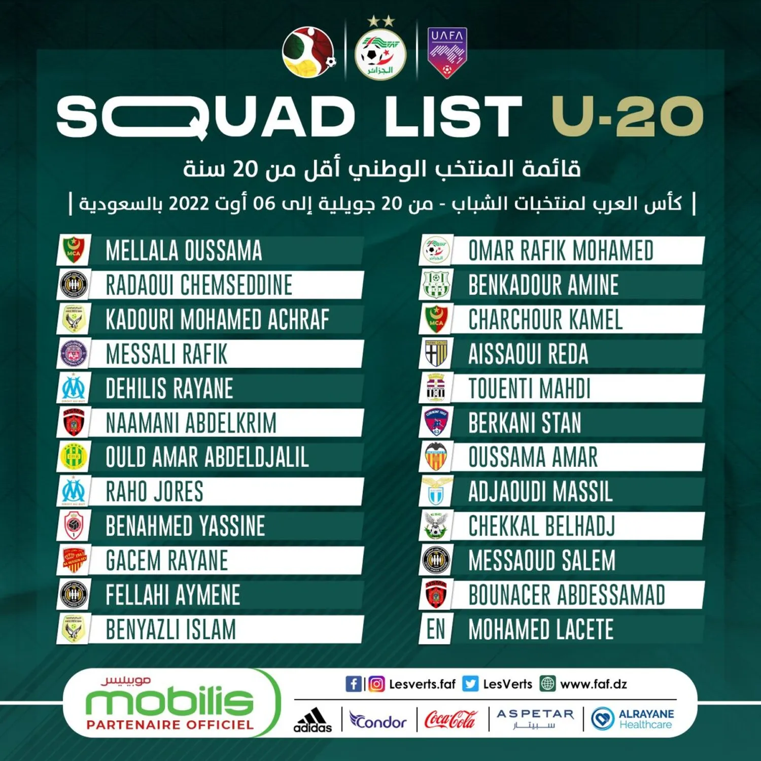 On note aussi la présence de Mohamed Omar Rafik (AC FAF), qui vient de disputer les Jeux Méditerranéens d’Oran avec la sélection U18, ou encore des binationaux Oussama Amar (Valence CF) et Reda Aissaoui (Parme).
