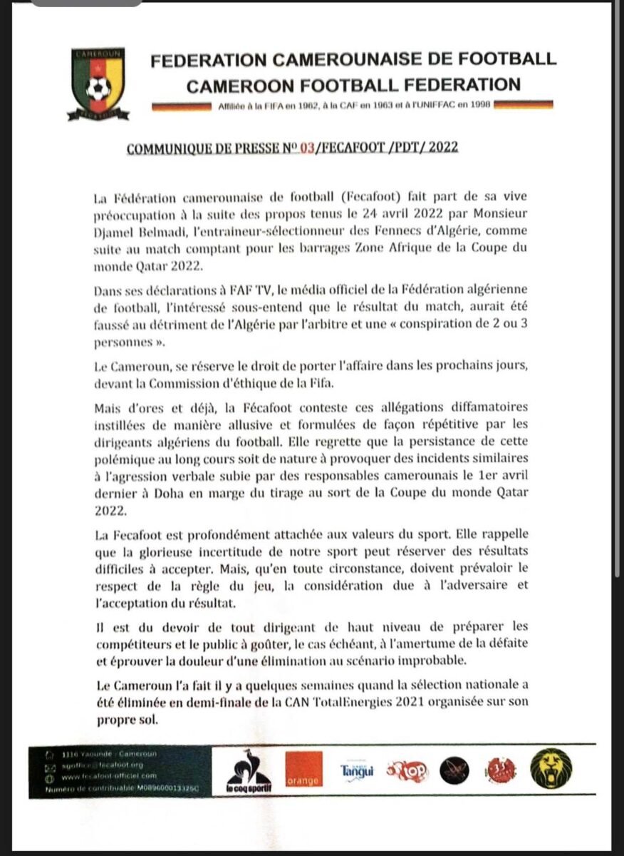 COMMUNIQUE DE PRESSE DU PRESIDENT DE LA FECAFOOT SUITE AUX PROPOS DU SELECTIONNEUR DE L'ALGERIE – Fédération Camerounaise de Football https://t.co/7KszkUBvPj