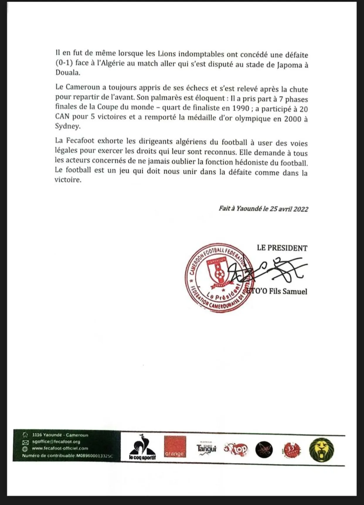 «L’intéressé sous-entend que le résultat du match aurait été faussé au détriment de l’Algérie par l’arbitre et une ‘conspiration de 2 ou 3 personnes’. Le Cameroun se réserve le droit de porter l’affaire dans les prochains jours devant la commission d’éthique de la FIFA», menace le document. «Mais d’ores et déjà, la Fecafoot conteste ces allégations diffamatoires instillées de manière allusive et formulées de façon répétitive par les dirigeants algériens du football. Elle regrette que la persistance de cette polémique au long cours soit de nature à provoquer des incidents similaires à l’agression verbale subie par des responsables camerounais le 1er avril dernier à Doha en marge du tirage au sort de la Coupe du monde Qatar 2022.»