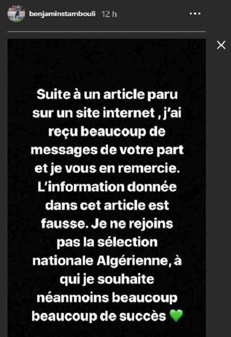 “Suite à un article paru sur un site internet, j’ai reçu beaucoup de messages de votre part et je vous en remercie. L’information donnée dans cet article est fausse. Je ne rejoins pas la sélection nationale algérienne, à qui je souhaite néanmoins beaucoup beaucoup de succès“, a indiqué l’ancien international Espoirs français.
