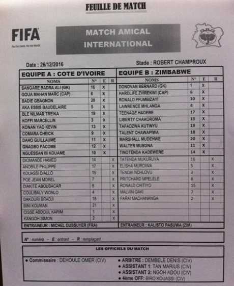 Qualifié pour la CAN 2017 (14 janvier-5 février), le Zimbabwe affrontait une sélection de Côte d’Ivoire essentiellement composée de joueurs locaux ce lundi en match amical à Abidjan. Et en ce Boxing Day, les deux équipes se sont tenues en respect (0-0). Pour rappel, le sélectionneur des Eléphants, Michel Dussuyer, dévoilera sa liste pour la CAN mercredi.