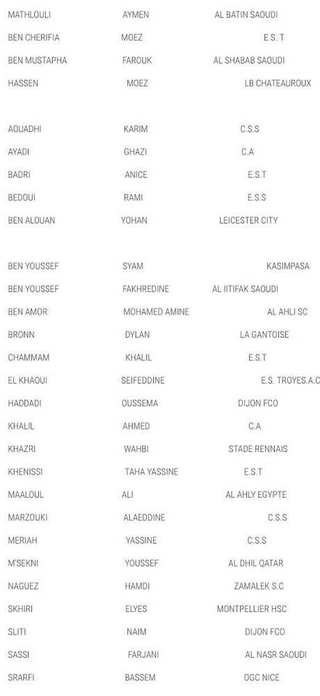 Attaquants : Anis Badri (ES Tunis), Fakhreddine Ben Youssef (Al-Ittifaq, Arabie Saoudite), Taha Yassine Khenissi (ES Tunis), Alaeddine Marzouki (CS Sfaxien)