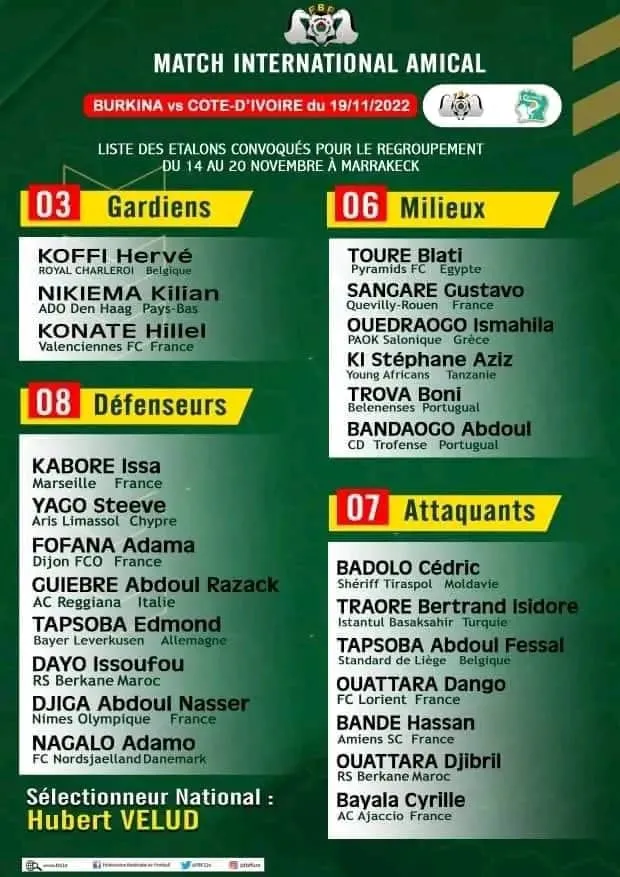 Le sélectionneur du Burkina Faso, Hubert Velud, a dévoilé sa liste de 24 joueurs retenus pour affronter la Côte d’Ivoire en match amical le 19 novembre à Marrakech au Maroc. Avec Bertrand Traoré, Dango Ouattara, Issa Kaboré, Hervé Koffi, Issoufou Dayo et Blati Touré, le technicien a décidé de faire appel à son épine dorsale.