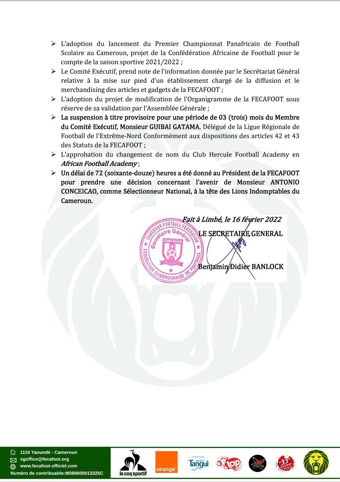 Le communiqué de la Fecafoot
