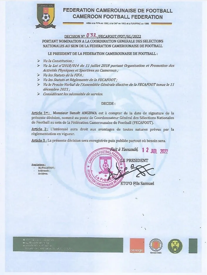 A quelques mois de la Coupe du monde 2022, ça bouge dans l’encadrement technique de la sélection du Cameroun ! Le président de la Fédération (Fecafoot), Samuel Eto’o, a en effet procédé mardi à une série de remaniements. Coordonnateur général des sélections nationales depuis janvier 2019, l’ancien international Bill Tchato en fait les frais puisqu’il est remplacé à son poste par Benoît Angbwa, lui aussi ex-coéquipier de l’attaquant. Cette décision risque forcément de faire jaser.
