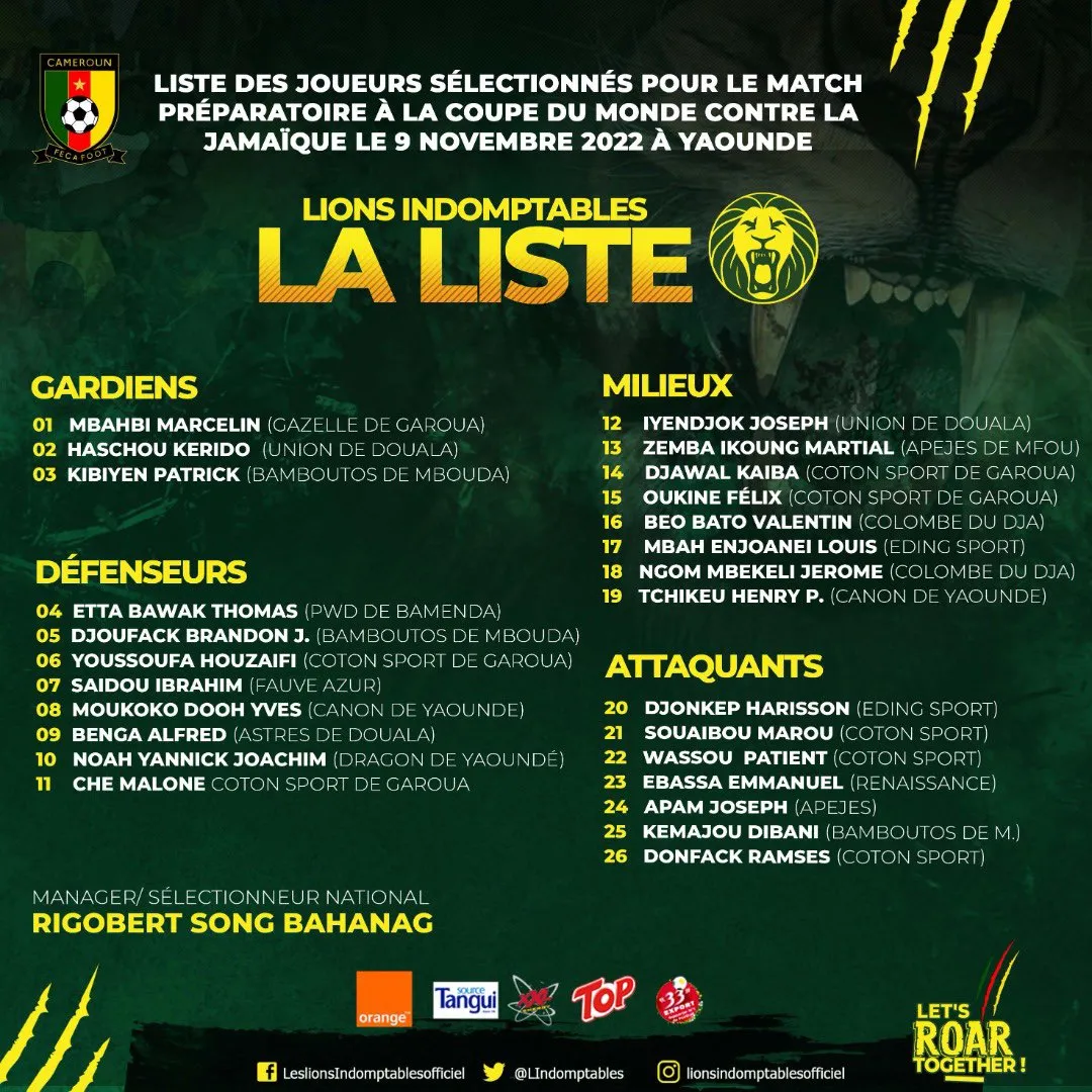 La liste du Cameroun contre la Jamaïque