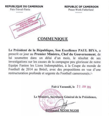 Au lendemain du retour de la sélection nationale du Cameroun de son court séjour au Brésil lors de la Coupe du monde 2014, le président de la république, Paul Biya a ordonné l’ouverture d’une enquête pour déterminer les causes de la débâcle des Lions Indomptables.