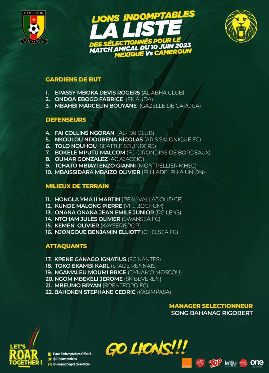 Liste des joueurs sélectionnés pour le match amical Mexique 🆚 Cameroun du 10 juin 2023 à San Diego. pic.twitter.com/0lbRuKHlmR
