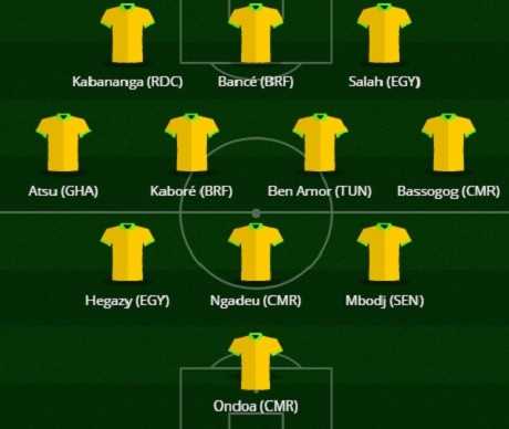 Pour finir, l’attaque de cette équipe est menée par un trio offensif de choix. Impliqué sur 4 des 5 buts de l’Egypte, dont deux bijoux, et auteur de gestes magnifiques (contrôle en porte-manteau, sombrero) tout au long du tournoi, Mohamed Salah aura été l’une des rares stars au niveau et mérite largement sa place. Sur l’aile opposée, on retrouve le grand bonhomme du premier tour, Junior Kabananga, meilleur buteur de cette CAN avec 3 réalisations et qui a scoré lors de chacune des sorties de la RD Congo dans le groupe C.