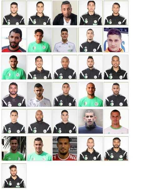 Attaquants : Ishak Belfodil (Standard Liège, Belgique), Yassine Benzia (Lille, France), Baghdad Bounedjah (Al Sadd, Qatar), Idriss Saadi (Courtrai, Belgique), Islam Slimani (Leicester City, Angleterre), Hilal Soudani (Dinamo Zagreb, Croatie)