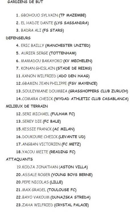Trois éléments sont convoqués pour la première fois : le gardien El Hadj Danté (Lys de Sassandra), le défenseur central Comara Cheick (WAC Casablanca) et le latéral gauche Souleymane Doumbia (Grasshopper Zurich). On note aussi la présence de l’attaquant Yakou Meité (Reading), qui avait été appelé en renfort en mars dernier mais qui sera pour la première fois présent dès la liste initiale. A noter que Doumbia comme Meité ont été formés au PSG et qu’ils évoluaient déjà avec les Espoirs ivoiriens.