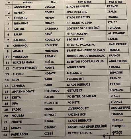 Longtemps blessé, Moussa Wagué (Barça B) doit se contenter d’une place parmi les réservistes avec le défenseur Pape Djibril Diaw (Korona Kielce, Pologne), les milieux de terrain Krépin Diatta (Bruges) et Assane Diousse (Saint-Etienne) et les attaquants de Metz Habib Diallo et Ibrahima Niane. Tous ces joueurs sont susceptibles d’être appelés en cas de blessure.