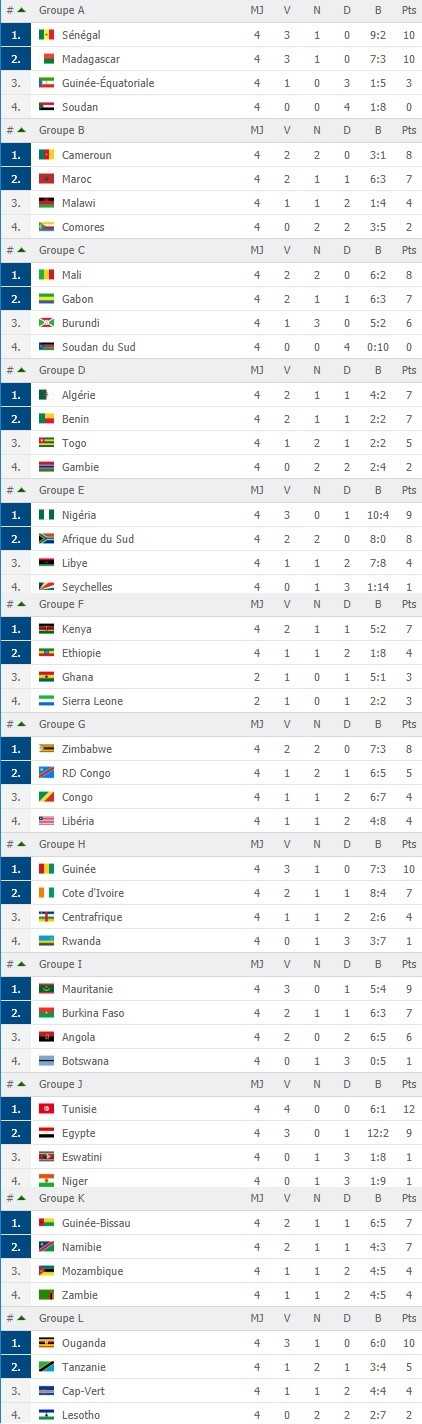 A l’issue de la 4e journée des éliminatoires de la CAN 2019 disputée dimanche et mardi, on connaît les 4 premières sélections qui ont validé leur billet pour la phase finale sur le terrain. Il s’agit de Madagascar, de la Tunisie, de l’Egypte et du Sénégal qui rejoignent le Cameroun, pays-hôte. A l’instar de la Guinée, de l’Algérie ou du Mali, d’autres ont en revanche manqué le coche et devront patienter au moins jusqu’au mois prochain avec la 5e journée au programme les 16, 17 et 18 novembre. Voici tous les résultats et les classements complets groupe par groupe.