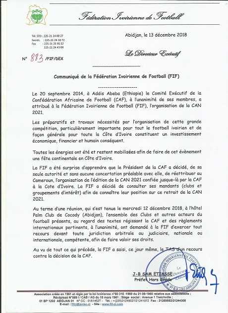 Très remontée contre la CAF qui va lui retirer l’organisation de la CAN 2021 pour la confier au Cameroun en lui demandant de patienter deux ans de plus, la Fédération ivoirienne de football (FIF) a annoncé jeudi qu’elle porte l’affaire devant le TAS.
