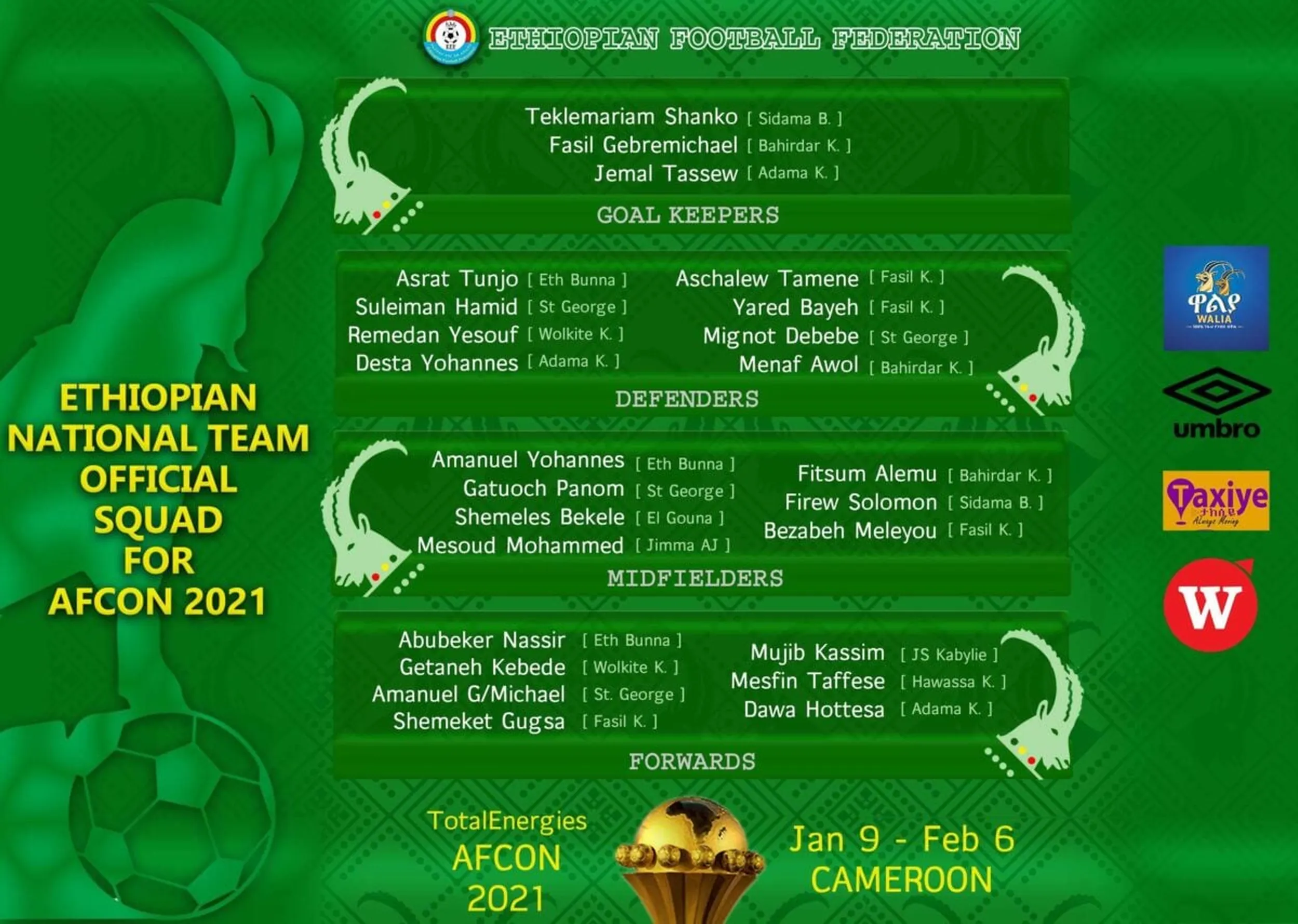 A l’image de leur attaquant vedette Getaneh Kebede (26 buts en 46 sélections), les Antilopes se présenteront avec une ossature essentiellement locale. Et pour cause, on compte seulement 2 expatriés dans le groupe ! Il s’agit du milieu offensif Shimelis Bekele, sociétaire d’El Gouna en Egypte, et de l’attaquant Mujib Kassim, qui évolue à la JS Kabylie.