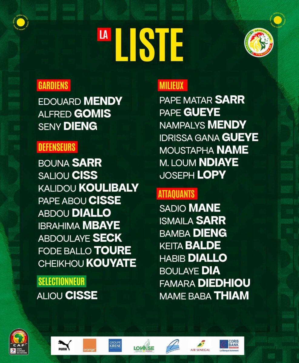 La principale information réside en la présence de Kalidou Koulibaly (Naples) et Ismaïla Sarr (Watford), actuellement blessés mais que Cissé espère récupérer à temps pour la compétition. Pour le reste, on retrouve les cadres Sadio Mané, Edouard Mendy, Gana Gueye ou encore Cheikhou Kouyaté et les visages qui ont rejoint les Lions au cours des derniers mois comme Bamba Dieng et Pape Gueye (OM), Bouna Sarr, Abdou Diallo, Fodé Ballo-Touré et Nampalys Mendy. Krépin Diatta est quant à lui absent sur blessure.