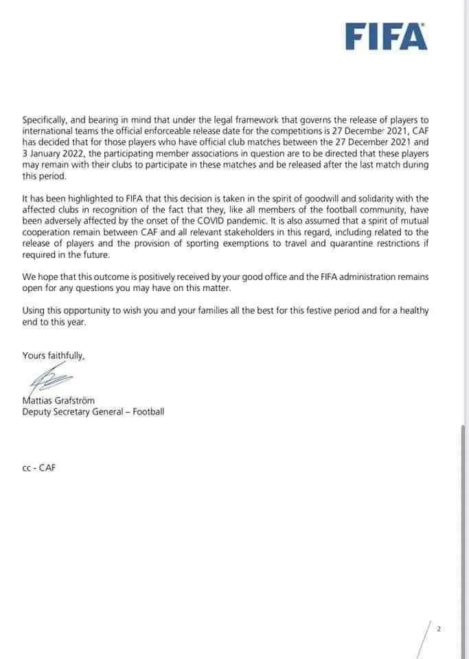 Ainsi, ce n’est plus à compter du 27 décembre, mais du 4 janvier que les clubs seront tenus de laisser les joueurs concernés par la CAN à disposition de leur sélection nationale. Le Forum des ligues mondiales, qui regroupe les principales ligues européennes, avait soumis cette requête la semaine dernière et celle-ci a finalement été acceptée. «La CAF a décidé de prendre un engagement de solidarité concernant la libération des joueurs par leurs clubs respectifs dans certaines circonstances», indique ainsi un courrier signé par le secrétaire général adjoint de la FIFA, Mattias Grafström, avant de détailler les modalités de ce compromis.