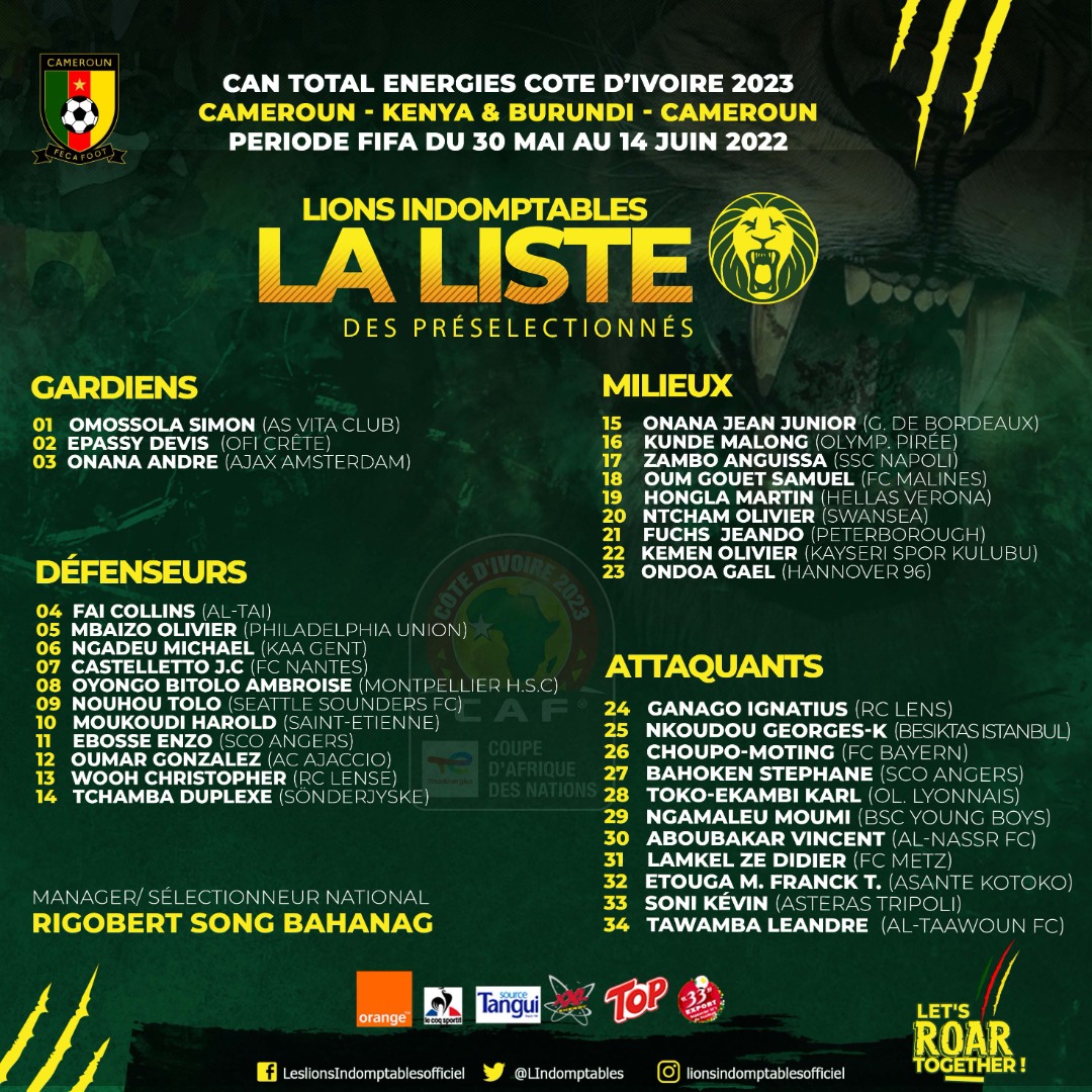 Qualifié pour le Mondial 2022, le Cameroun débute les éliminatoires de la CAN 2023 contre le Kenya (4 juin) et le Burundi (8 juin) le mois prochain. Le sélectionneur des Lions Indomptables, Rigobert Song, a publié ce vendredi une liste de 34 joueurs présélectionnés pour l’occasion.