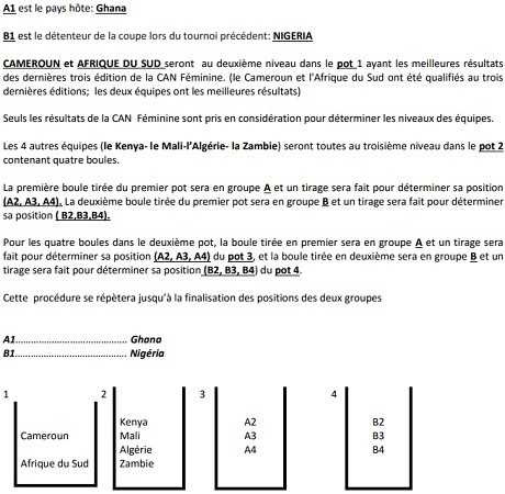 En vertu de leurs performances au cours des trois dernières éditions, le Cameroun et l’Afrique du Sud sont quant à eux placés dans le pot 1, ce qui les assure de ne pas tomber face à face. Enfin, le Kenya (qui a remplacé la Guinée Equatoriale, disqualifiée de dernière minute), le Mali, l’Algérie et la Zambie figurent dans le pot 2, sans protection particulière.