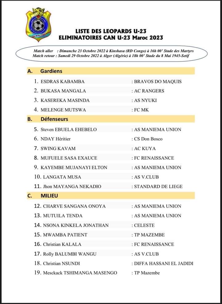 Pour l’occasion, le sélectionneur des Léopards U23, Raoul Shungu, a retenu 28 joueurs. On retrouve parmi eux trois expatriés : le défenseur central John Nekadio, membre de l’équipe U23 du Standard de Liège et frère de l’international A Christian Luyindama, mais aussi le milieu défensif Christian Nsundi, sociétaire du Difaâ El Jadida au Maroc, et le gardien Esdras Kabamba, qui évolue à Bravos Do Maquis en Angola.