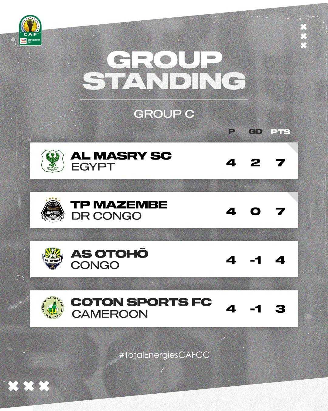 Dans le groupe C, le TP Mazembe a limité la casse lors de son déplacement sur le terrain de CotonSport (2-2). Menés à deux reprises sur des buts camerounais signés Marou (15e) et Masengo contre son camp (67e), les hommes de Franck Dumas ont égalisé grâce à Kitambala (42e) puis Mondeko (90+4e). Ce partage des points permet à Al Masry, vainqueur 1-0 de l’AS Otohô, de rejoindre le TPM en tête et de le doubler au bilan des confrontations directes.