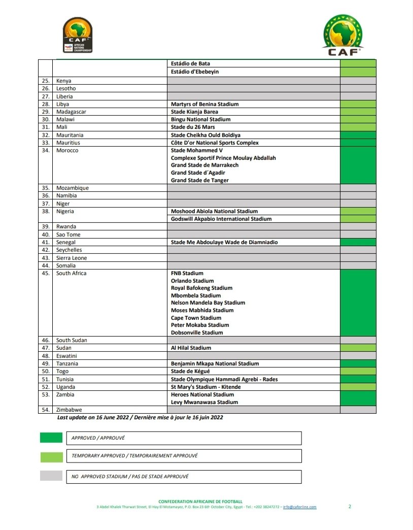 La liste des stades homologués par la CAF pour les éliminatoires du CHAN 2022