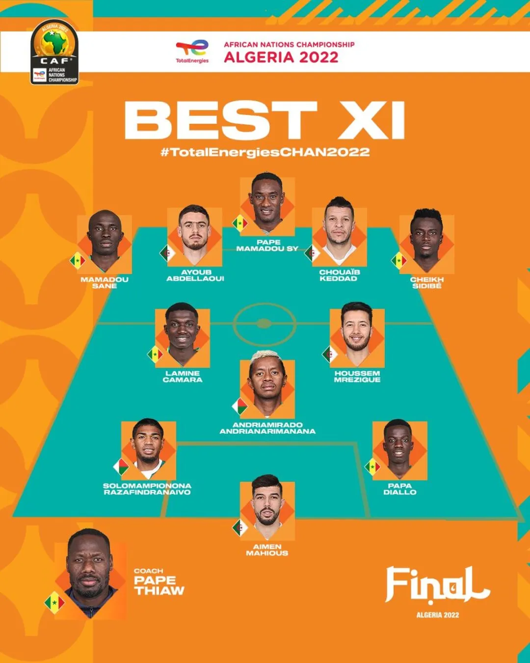 Trois jours après la finale du CHAN 2022 remportée par le Sénégal face au pays-hôte, l’Algérie (0-0, 5-4 tab), la Confédération africaine de football (CAF) a dévoilé ce mardi son équipe-type de la compétition.