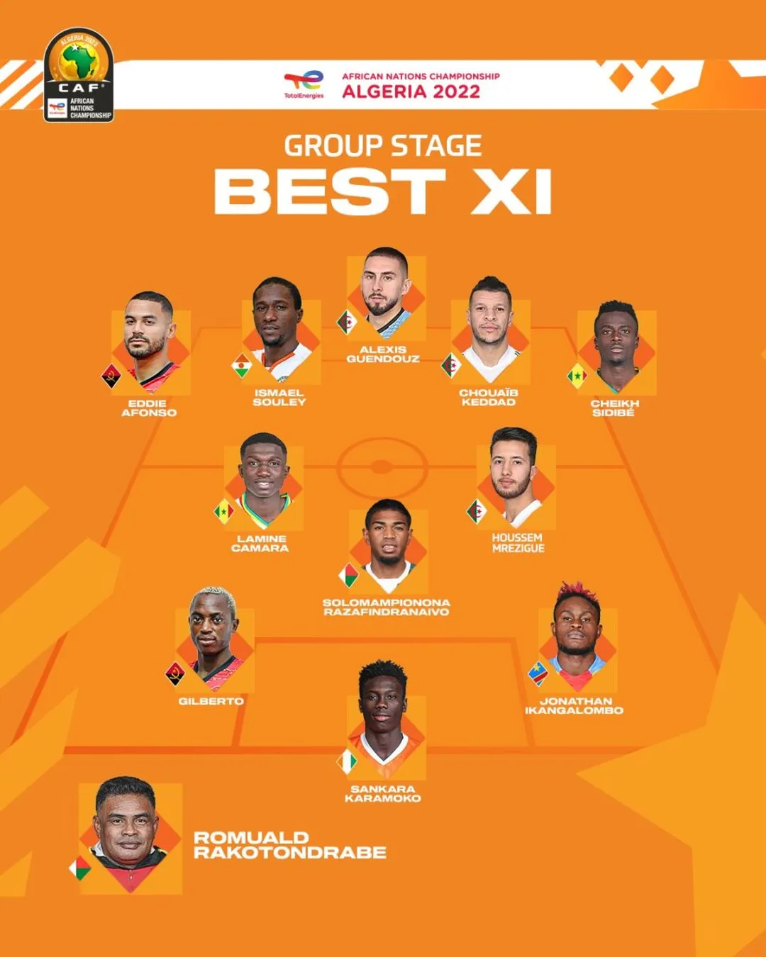 Le pays-hôte ayant réalisé un sans-faute, il est logiquement le plus représenté dans ce onze avec Alexis Guendouz, élu meilleur gardien du premier tour, plus le défenseur central Chouaib Keddad et le milieu de terrain Houssem Mrezigue. On retrouve aussi 2 Sénégalais (Cheikh Sidibé et Lamine Camara), 2 Angolais (Eddie Afonso et Gilberto), un Ivoirien (Sankara Karamoko, auteur d’un but et d’une passe décisive contre l’Ouganda), un Congolais (l’ailier Jonathan Ikangalombo) et un Nigérien (le défenseur Ismaël Souley).