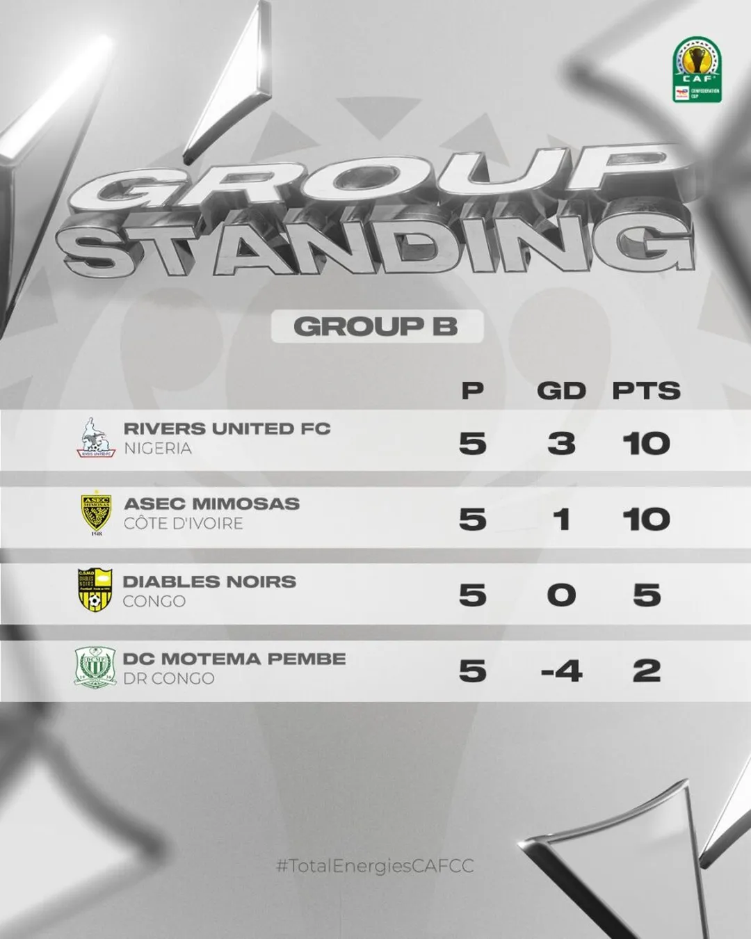 Tout est plié aussi dans le groupe B. Bien que tenus en échec à domicile par Diables Noirs (2-2), les Nigérians de Rivers United se qualifient en éliminant par la même occasion les Congolais. Même sanction pour les Congolais de RDC du DC Motema Pembe, battus 2-1 en Angola, où le match était délocalisé, par l’ASEC Mimosas sur un doublé d’Aubin Kramo (27e, 90e). Les Ivoiriens verront les quarts !