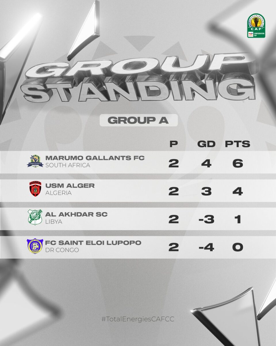 Dans le groupe A enfin, les Sud-Africains de Marumo Gallants font la course en tête après leur nouvelle victoire sur le terrain de Lupopo (1-2), qui a confirmé la sale journée des clubs congolais (deux défaites et un nul à domicile). L’USM Alger est solide 2e après être rentrée indemne de son déplacement contre les Libyens d’Al Akhdar (1-1). Le Botswanais Tumusang a égalisé dix minutes après l’ouverture du score adverse (77e).