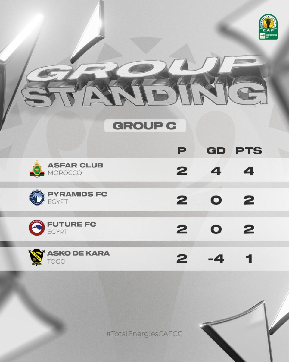 Tout baigne en revanche pour les FAR Rabat dans la poule C. Après leur bon match nul en Egypte sur le terrain de Pyramids (2-2), les Marocains ont cartonné à domicile contre les Togolais d’ASKO de Kara (5-1). Mohamed Hrimat (39e), Ahmed Hammoudan (50e), Igmane Hamza (63e), Mustapha Sahd (67e) et Zakaria Fati (92e) ont fait trembler les filets. Pyramids peine en revanche à décoller et a concédé un deuxième match nul sur le terrain de ses compatriotes égyptiens du Future FC (1-1).