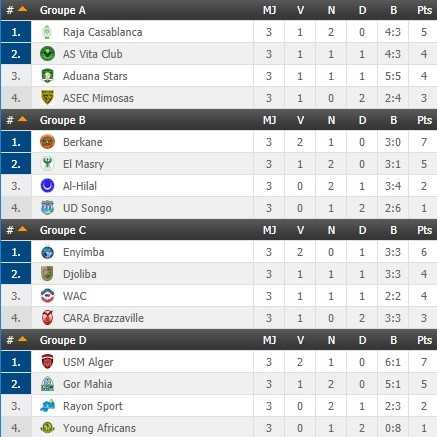 Vainqueur de l’ASEC Mimosas en Côte d’Ivoire (1-0), le Raja Casablanca s’est détaché en tête du groupe A de la Coupe de la CAF mercredi à l’occasion de la 3e journée. En revanche, Vita Club a signé une mauvaise opération en se laissant surprendre au Ghana. De leur côté, l’USM Alger et Gor Mahia ont fait le trou au sommet de la poule D. Ailleurs, la RS Berkane conserve son avance en tête du groupe B, tandis qu’Enyimba s’empare des commandes de la poule C.