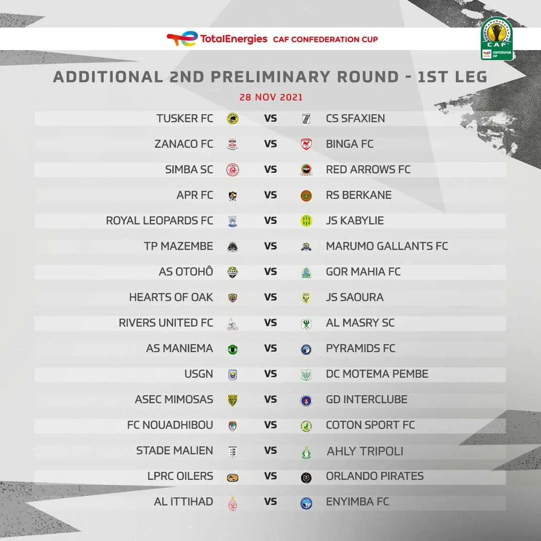 Finaliste la saison passée, la JS Kabylie se déplace quant à elle en Eswatini pour défier les Royal Léopards, tandis que la RS Berkane, vainqueur de la compétition en 2020, se rend au Rwanda pour affronter APR FC. A suivre aussi AS Maniema Union (RD Congo)–FC Pyramids (Egypte), Tusker (Kenya)–CS Sfaxien (Tunisie), Hearts of Oak (Ghana)–JS Saoura (Algérie) ou encore Nouadhibou (Mauritanie)–Coton Sport (Cameroun) et Stade Malien (Mali)–Ahly Tripoli (Libye). Les matchs retours auront lieu dans une semaine, les 16 qualifiés accéderont à la phase de groupes.