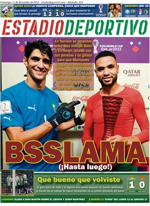 L’Espagne, éliminée en huitièmes de finale par les Marocains (0-0, 0-3 tab), ne se montre pas rancunière et salue abondamment l’exploit de son voisin. «L’étoile du Maroc», titre ainsi Marca en référence au drapeau du royaume chérifien. «Un Maroc de classe mondiale», abonde AS, l’autre grand quotidien madrilène. «Historique», salue Mundo Deportivo en Catalogne. Enfin, le journal andalou Estadio Deportivo encense la prestation XXL des deux Sévillans Yassine Bounou et Youssef En-Nesyri, en titrant sur «à bientôt» comme pour signifier que l’aventure se poursuit.