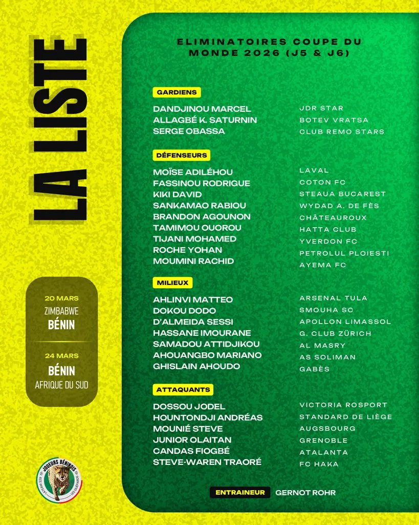 Le sélectionneur de l’équipe du Bénin, Gernot Rohr, a dévoilé sa liste en vue des deux prochaines journées des éliminatoires de la Coupe du monde 2026.