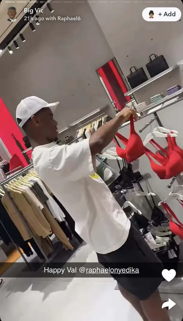 In a video shared by his Super Eagles teammate and Bayer Leverkusen forward Victor Boniface via Snapchat, Onyedika could be seen in the lingerie section of a store carefully selecting wears that would make the perfect gift for the mystery woman.
