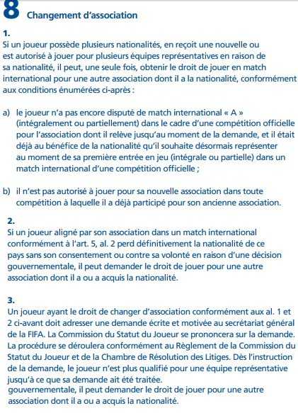 L’article 8 du Règlement d’application des Statuts FIFA