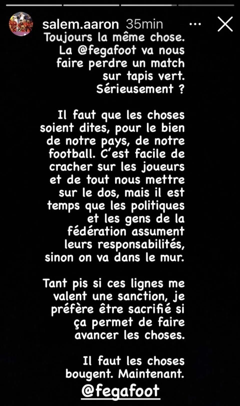 Pour l’attaquant Aaron Boupendza, présent parmi la délégation, cet incident est celui de trop. Le buteur d’Al-Arabi a poussé un énorme coup de gueule à l’encontre de la Fédération gabonaise de football (Fegafoot) sur Instagram. «Toujours la même chose. La Fegafoot va nous faire perdre un match sur tapis vert. Sérieusement ?», a taclé l’ancien Bordelais. «Il faut que les choses soient dites, pour le bien de notre pays, de notre football. C’est facile de cracher sur les joueurs et de tout nous mettre sur le dos, mais il est temps que les politiques et les gens de la Fédération assument leurs responsabilités, sinon on va dans le mur. Tant pis si ces lignes me valent une sanction, je préfère être sacrifié si ça permet de faire avancer les choses. Il faut que les choses bougent. Maintenant.»