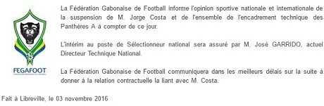 C’était pressenti depuis quelques heures, c’est désormais officiel. Sur son site, la Fédération gabonaise (Fegafoot) a annoncé jeudi soir la “suspension” du sélectionneur Jorge Costa, et son remplacement à titre d’intérimaire par l’actuel directeur technique national, José Garrido. “La Fédération Gabonaise de Football informe l’opinion sportive nationale et internationale de la suspension de M. Jorge Costa et de l’ensemble de l’encadrement technique des Panthères A à compter de ce jour“, indique le communiqué. “La Fédération Gabonaise de Football communiquera dans les meilleurs délais sur la suite à donner à la relation contractuelle la liant avec M. Costa.”