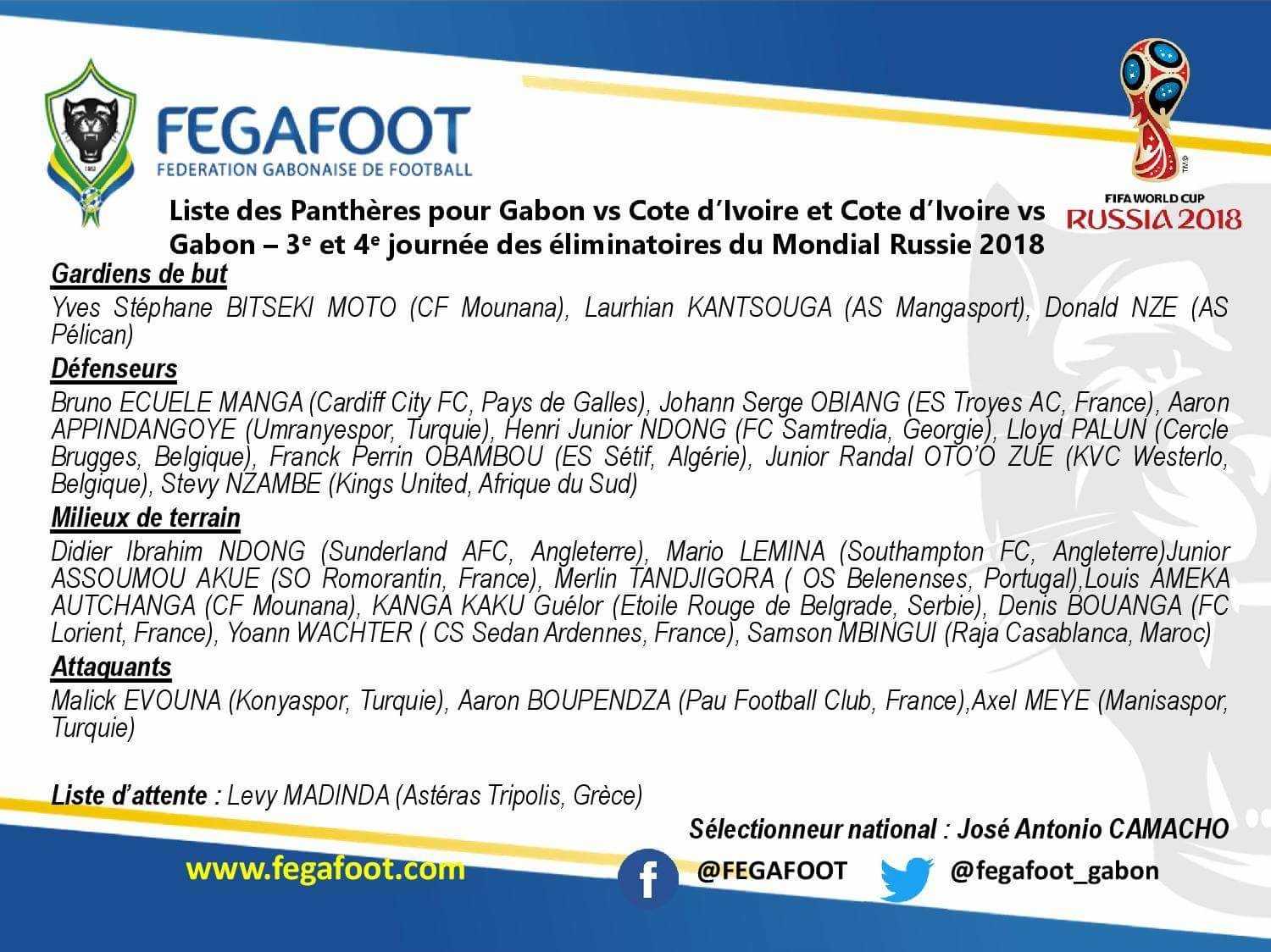 En prévision de la double confrontation face à la Côte d’Ivoire les 2 et 5 septembre prochains dans le cadre des 3e et 4e journées des éliminatoires du Mondial 2018 (aller à Libreville, retour à Bouaké), le sélectionneur du Gabon, José Antonio Camacho, a dévoilé ce samedi sa liste de convoqués. Déjà absent en juin, Pierre-Emerick Aubameyang manque encore à l’appel. De quoi interroger une fois encore sur ses intentions vis à vis de la sélection… Ngouali est pour sa part absent sur blessure. Evouna signe en revanche son retour.