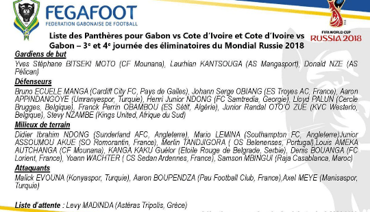 Milieux : Didier Ibrahim Ndong, Abdoulaye Tandjigora, Samson Mbingui, Kanga Guelor Kaku, Mario Lemina, Denis Athanase Bouanga, Yoann Claude Wachter, Junior Assoumou Akoue, Louis Ameka Autchanga