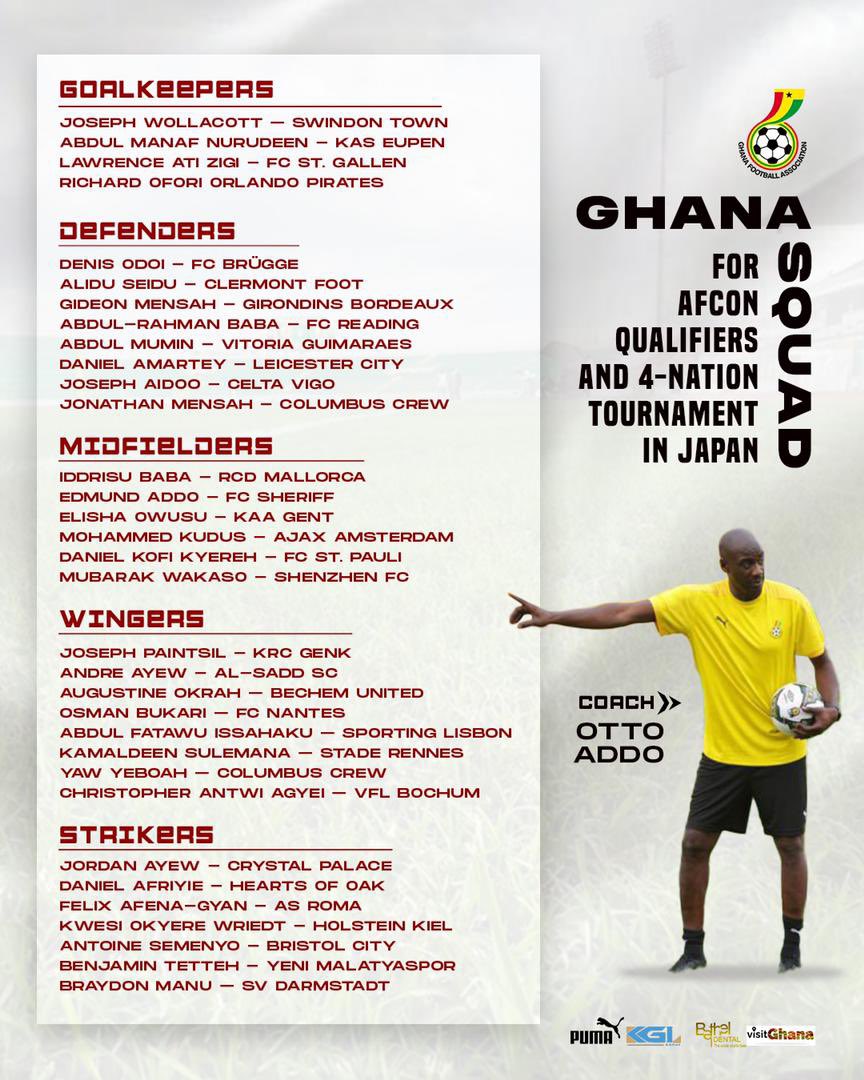 Suspendu en mars suite à son expulsion à la CAN, le capitaine André Ayew effectue son grand retour avec le Rennais Sulemana, Wakaso et Jonathan Mensah. Les cadres Thomas Partey (Arsenal) et Alexander Djiku (Strasbourg) manquent en revanche à l’appel sur blessure.
