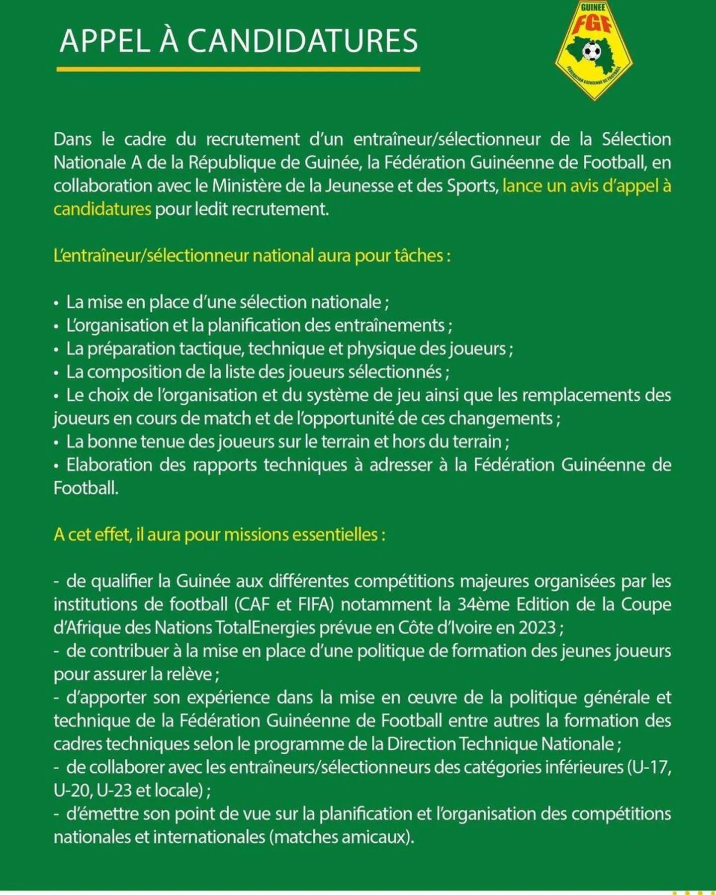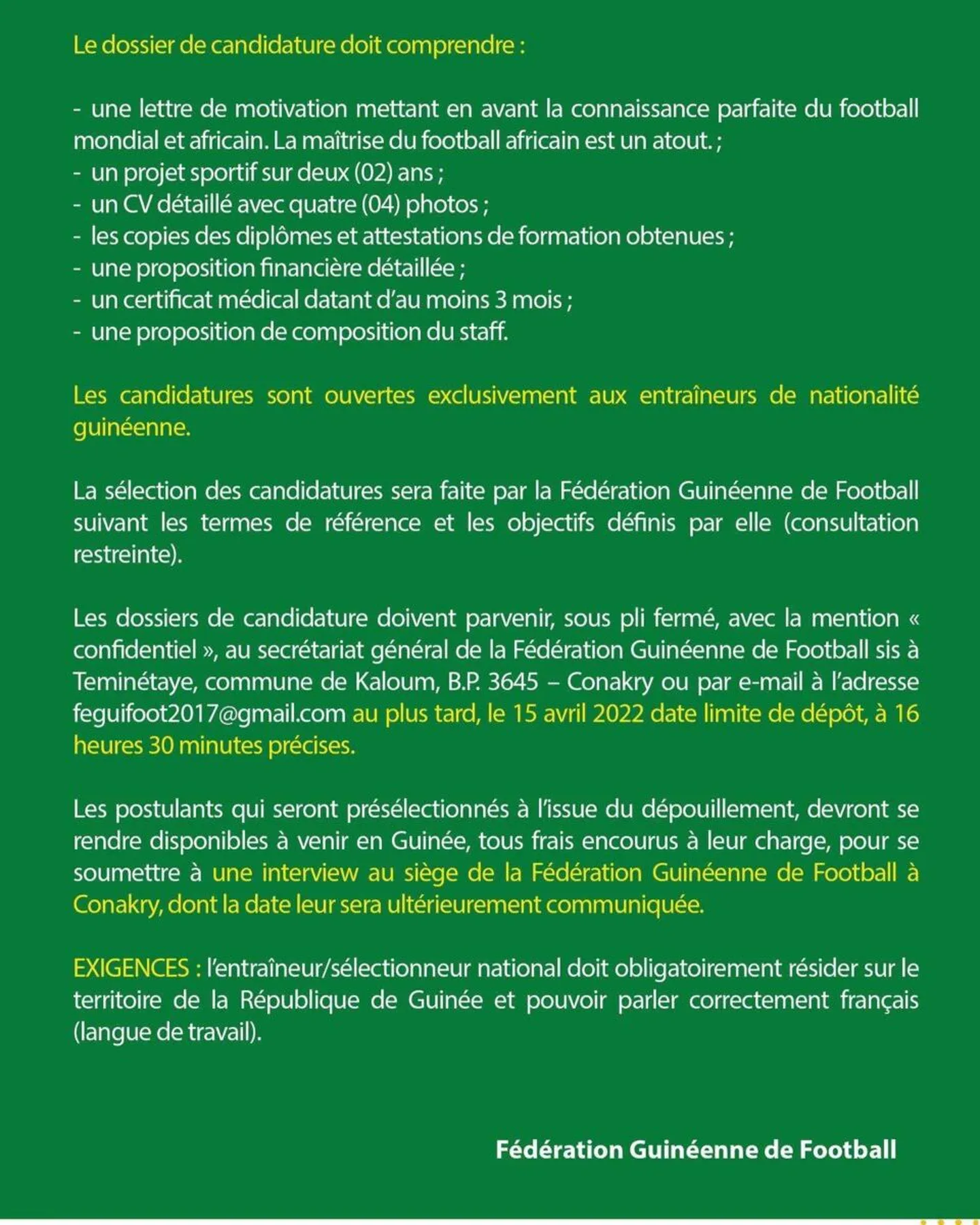 Principale information : «les candidatures sont ouvertes exclusivement aux entraîneurs de nationalité guinéenne», indique l’instance, ce qui signifie que le prochain homme fort du Syli National sera forcément un technicien local. Un choix assez logique après l’échec du Français Didier Six, limogé en novembre, juste avant le passage express de Kaba Diawara.