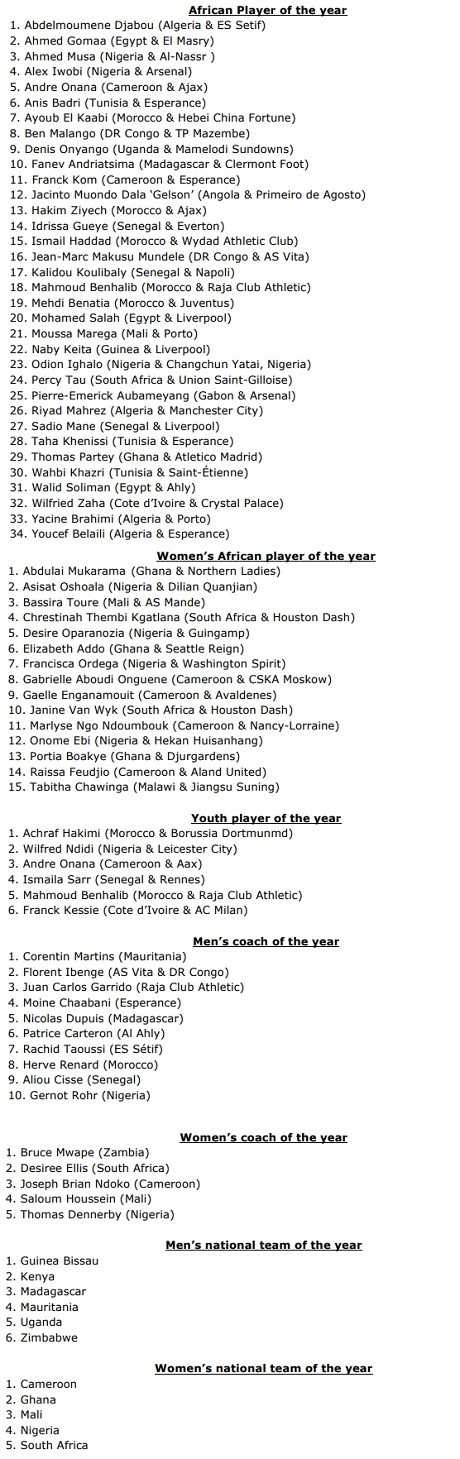Tous les nommés pour les CAF Awards :
