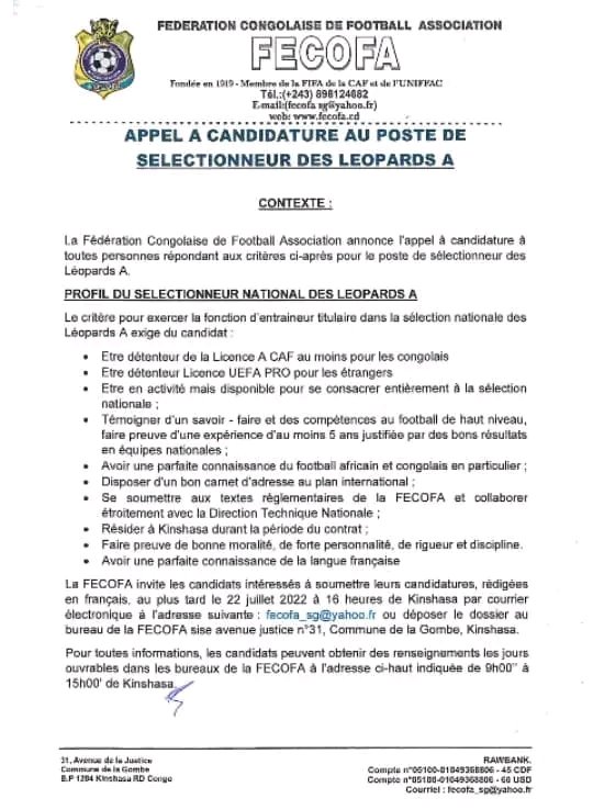 L'appel à candidatures pour le poste de sélectionneur de la RDC