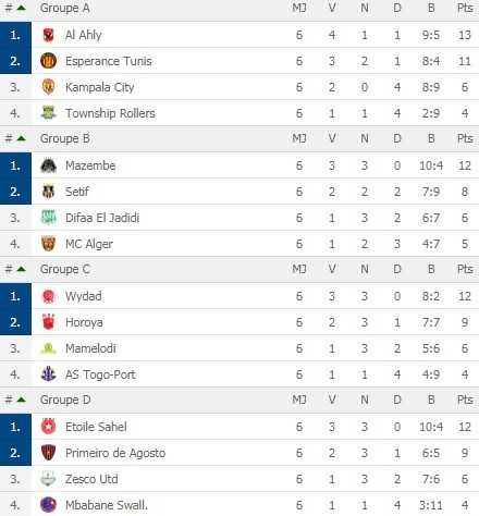 La mine des mauvais jours s’est également lue sur tous les visages du côté de la capitale algérienne où le MC Alger a laissé passer sa chance à domicile en s’inclinant 2-1 sur ses terres face à ses compatriotes de l’ES Sétif, qui accompagneront le TP Mazembe en quart de finale. Djahnit (5e) et Bouguelmouna (27e) ont rapidement fait la différence pour l’ESS et la réduction du score de Derrardja avant la pause sur penalty (41e sp) n’aura pas suffi pour relancer le MCA qui termine finalement bon dernier de la poule. L’Aigle Noir se qualifie quant à lui avec 2 points d’avance sur le Difaa El Jadida, qui avait encore un espoir de qualification et qui a arraché le nul face au TP Mazembe (1-1), en vain.