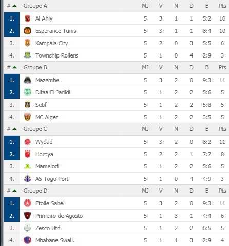 Dans la poule B, c’est l’embouteillage avec le Difaâ El Jadida, le MC Alger et l’ES Sétif qui sont tous à 5 points et au coude à coude derrière le TP Mazembe, déjà qualifié et assuré de la tête. Sur ces trois prétendants, il n’en restera qu’un. Dans le groupe D enfin, 3 équipes se battront également pour accompagner l’Etoile du Sahel, qualifiée et assurée de la tête. Mieux placé en termes de points, Primeiro de Agosto a la faveur des pronostics et les Angolais ont l’avantage d’avoir leur destins en mains et de jouer à domicile contre Mbabane Swallows. Zesco conserve également un petit espoir.