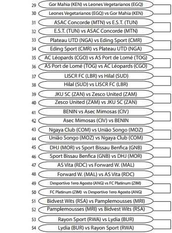En revanche, l’Espérance Tunis sera sur le pont et se rendra en Mauritanie pour défier l’ASAC Concorde. Côté algérien, l’ES Sétif hérite des Centrafricains de Bangui, tandis que le MC Alger partira dans l’inconnu face aux Congolais de l’AS Otoho. Les Ivoiriens de l’ASEC Mimosas affronteront un club béninois à définir, tandis que les Congolais de Vita Club vont en découdre avec les Malawites du MTL Wanderers. Déplacement original pour les Marocains du Difaa El Jadida qui se rendront en Guinée Bissau pour défier Sport Bissau Benfica. A suivre aussi les matchs Horoya-AS Fans (Niger) et Génération Foot-Misr Makassa.