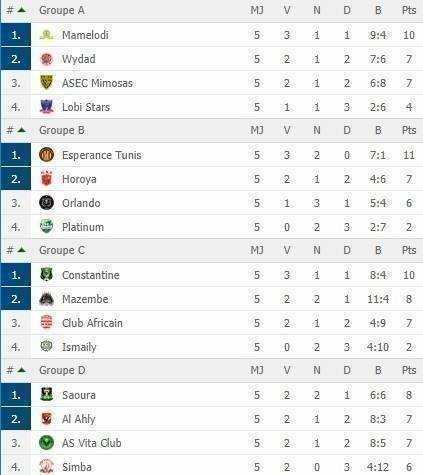 Dans le groupe C, le CS Constantine est pratiquement qualifié et le TP Mazembe devra s’imposer à domicile face aux Algériens sous peine d’être mis en danger par le Club Africain qui conserve un mince espoir de qualification s’il bat Ismaily. Enfin, la poule D s’annonce très ouverte puisque les vainqueurs des matchs Al Ahly-JS Saoura et Simba-Vita Club valideront leur billet.
